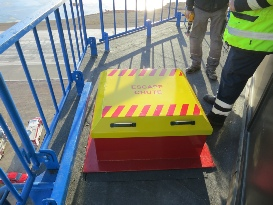 The deck mountable chute container requires a cut out of approx. 900m x 900m (35.4” X 35.4”) or fits into a deck mounted support frame (supplied as an option by RSS and has a hydraulically dampened lid and lower trap door. The lid assembly is safety yellow and decaled with red chevrons and the wording ‘Escape Chute’. A serial number identification plate is provided and lists the system serial/model number with the date of manufacturer and RSS emergency contact telephone numbers.